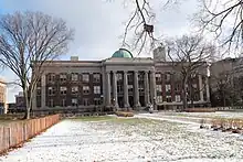 Built to replace Pattee Hall as the home of the University's Law School at the request of the School's third dean, Everett Fraser; whom the building was named after; as he believed Pattee's classrooms were inadequate and its library too flammable. The Law School remained at Fraser Hall for 50 years until it moved to Mondale Hall,[27] after which Fraser became a multi-purpose building. It was renovated once in the 1950s but received no structural upgrades for almost 70 years, resulting in the approval of a $144.7 million expansion by the State Legislature in 2023.[28] The State's grant covers two thirds of the cost, while the remaining third is set to be paid by the College of Science and Engineering over the course of 20 years.[24] Construction began in September of that year, and is expected to last until 2025. The original renovation is to be removed, while 18 new chemistry labs, collaboration spaces, and general-purpose classrooms will be added.[28]