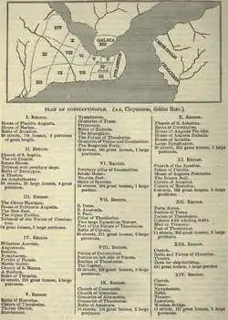 The Notitia Urbis Constantinopolitanae is an ancient "regionary", i.e., a list of monuments, public buildings and civil officials in Constantinople during the mid-5th century (between 425 and the 440s), during the reign of the emperor Theodosius II. The text lists the fourteen regions in which Constantinople was divided, along with the major public buildings such as fora, theatres, churches, palaces, baths and cisterns. It also lists the number of "houses" (domus), although there is uncertainty over the exact meaning of the term. Finally, the list includes the civil officials of each region, including the curators, the heads of the associations (collegia) and the heads of neighbourhoods (vicomagistri).