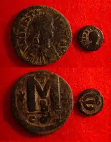 The term nummus is now usually applied solely to the 5th–7th century Byzantine issues. These were small, badly struck coins, weighing less than 1 gram, forming the lowest denomination of Byzantine coinage. They were valued officially at 1⁄7,200 of the gold solidus but more usually rated to 1⁄6,000 or 1⁄12,000.[5] The nummus usually featured the profile of the reigning Byzantine emperor on the obverse and the Byzantine imperial monogram on the reverse, although some coins of Emperor Justinian I (r. 527–565) display its numerical value by the Greek numeral "A" instead.[5]