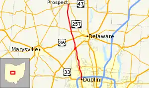 State Route 257 (SR 257, OH 257) is a 26.19-mile (42.15 km) north - south state highway in the central portion of the U.S. state of Ohio. The highway's southern terminus is in the northwestern Columbus suburb of Dublin at a roundabout intersection with U.S. Route 33 (US 33) and SR 161. This mainly two-lane highway follows the eastern side of the Scioto River from Dublin to its junction with US 42. After crossing over the river with the U.S. highway, SR 257 parallels the river's western bank. SR 257 has its northern terminus at a T-intersection with SR 47 on the western village limits of Prospect. SR 257 was created in 1926, and extended in 1935 and 1937.
