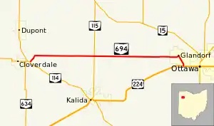SR 694 begins at an intersection with SR 114 on the bank of the Auglaize River. The route heads north as a two-lane highway, passing through woodland and farmland. The road turns due east passing through farmland, with some houses. The highway has an intersection with SR 115 in rural Putnam County. East of the intersection the route passes a golf course and a few houses, before returning to passing mostly farmland. SR 694 curves northeast and enters the village of Glandorf. The road turns southeast and passes through industrial and residential properties. The route curves due some and has an intersection at U.S. Route 224 (US 224). This intersection is the eastern terminus of SR 694.[2][3][4]