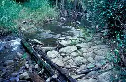 In the south-west corner, the log appears to extend into the creek bank and is covered by sediments, indicating a continuation of the fording. Combined with the presence of sandy loam sediments extending approx 12 to 13 metres (39 to 43 ft) further south up the embankment, the apparent extension of the log may indicate the fording extends further into the southern bank than what is currently exposed.[1]