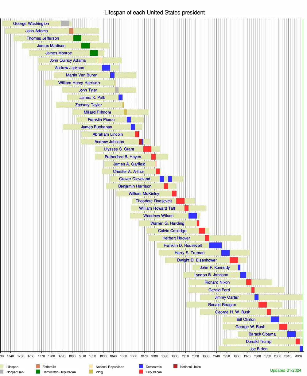 This is a graphical lifespan timeline of the presidents of the United States. They are listed in order of office, with Grover Cleveland listed in the order of his first presidency.