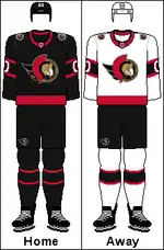 In 2020, the Senators reintroduced its 1997–2007 logo with the jersey set used from 1992 to 1995.[178] The updated logo uses a gold outline as opposed to red. The new uniforms, while largely resembling the originals from the 1990s, retained the lettering font used since the Adidas takeover, while the white uniforms retained only the black and red stripes along the upper arm sleeves. Both the home and away uniforms include a red band across the very bottom of the jerseys.[179][180] In addition, the Senators unveiled a "Reverse Retro" alternate uniform; the design was of the original 1992–93 uniform but with red as the base colour.[181] In the 2022–23 season, the Senators wore "Reverse Retro" uniforms based on the alternates they wore from 1997 to 2007, but with the current 2-D logo in front, black as the base colour and less white elements.[182]