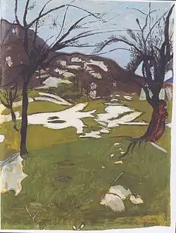 Otto Meyer renamed himself Meyer-Amden after having experienced such a profound connection to the village he'd lived in. He left behind around 500 paintings and drawings; abstract figure paintings with expressive and religious elements, scenes depicting youths at boarding schools, street scenes in Zürich, and watercolors with symbolic linear compositions. His interest in representing young men is often attributed to his homosexuality.[3] Although he never made a living from his work, he is now remembered as an important predecessor for abstract painting in Switzerland and for his influence on Oskar Schlemmer.[4]