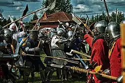 During two festival days, there are knightly tournaments on foot, battles between archers, halberdiers and spearmen, full-contact mass battles (buhurts), a "Battle of the Yards" tournament, equestrian tournaments and fight demonstrations.[8] The central event is the reconstruction of the Battle of Grunwald, that took place on July 15, 1410, at the Prussian town of Grunwald (modern territory of Poland).[2]