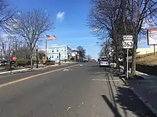 The route briefly forms the border between the borough of Hatboro to the east and Upper Moreland Township to the west before fully entering Hatboro past the Newington Drive intersection. Here, PA 263 heads north prior to turning northeast and intersecting Horsham Road.[3] At this point, the route crosses the Pennypack Creek and heads into downtown Hatboro as a three-lane road with a center left-turn lane.[3][4] The route turns north at Byberry Road and becomes North York Road at the Moreland Avenue intersection before it comes to a junction with the western terminus of PA 332 (East Montgomery Avenue).[3] After intersecting Summit Avenue, PA 263 leaves the downtown area and continues north, passing residential areas with a few businesses. Further north, the route widens into a four-lane undivided road.[3][4]