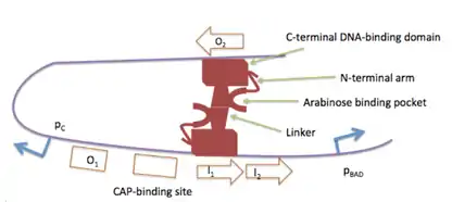Without arabinose, and regardless of glucose concentration, the PBAD and PC promoters are repressed by AraC.[2][7] The N-terminal arm of AraC interacts with its DNA binding domain, allowing two AraC proteins to bind to the O2 and I1 operator sites.[1] The O2 operator is situated within the araC gene. An AraC dimer also binds to the O1 operator and represses the PC promoter via a negative autoregulatory feedback loop.[2] The two bound AraC proteins dimerize and cause looping of the DNA.[3][4] The looping prevents binding of CAP and RNA Polymerase, which normally activate the transcription of both PBAD and PC.