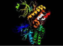 - ↑ Bullock AN, Russo S, Amos A, Pagano N, Bregman H, Debreczeni JE, Lee WH, von Delft F, Meggers E, Knapp S (2005). "Crystal Structure of the PIM2 Kinase in Complex with an Organoruthenium Inhibitor". PLOS ONE. 4 (10): e7112. doi:10.1371/journal.pone.0007112. PMC 2743286. PMID 19841674.
