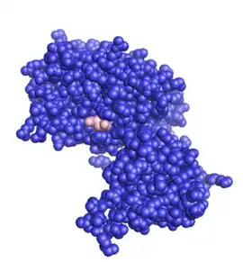 The structure of the core of PTEN (solved by X-ray crystallography, see figure to the upper right[5]) reveals that it consists primarily of a phosphatase domain, and a C2 domain: the phosphatase domain contains the active site, which carries out the enzymatic function of the protein, while the C2 domain binds the phospholipid membrane. Thus PTEN binds the membrane through both its phosphatase and C2 domains, bringing the active site to the membrane-bound PIP3 to dephosphorylate it.