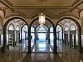 Inside, the monumental staircase and the lighting through large Skylights on the roof are remarkable. On the ground floor, there is a central hall on large pillars topped by a large skylight and a Stained glass window with the coat of arms of the province of Pontevedra. The plenary room is decorated with antique plasterwork. Innovative materials for the time are used in the interior of the building, such as iron in the Dormers and the mansard.[6]