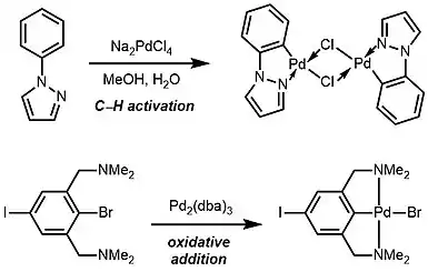 - ↑ Trofimenko, S. (1973-06-01). "Cyclopalladation reaction". Inorganic Chemistry. 12 (6): 1215–1221. doi:10.1021/ic50124a001. ISSN 0020-1669.