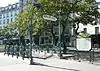 Rather than stone, Guimard used cast iron set in concrete both to reduce costs and to suit the sinuous Art Nouveau forms;[3][6] they were painted in a green emulating weathered brass.[7] (For a renovation that began in 1999, the RATP, the Paris transportation authority, restored the entrances to two slightly different shades: at sites with a lot of vegetation, vert wagon ('train-car green'), the dark green used for Parisian public works at the turn of the 20th century, and at fully urban sites, a slightly bluer shade, vert allemand ('German green').[8]) He designed standardized components, including railing cartouches incorporating the letter "M" and signs in his own distinctive lettering reading "Métropolitain" or, at narrow entrances, "Métro"; later the use of the lettering was extended to a holder for a system map and for advertising (porte-plan) with the station name above. In addition to speed (the first set of entrances were installed within six months of their design)[9] and relatively low cost in manufacture and adaptation to different sizes and locations of entrances, all of this gave the system a stylistic identity.[6][10]