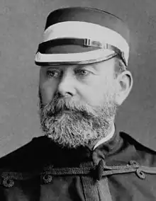 On 22 June 1854 he left Hamburg for Australia on the Reiherstieg, landing at Port Adelaide on 26 October. He may have headed, like so many, for the Victorian goldfields[2] but in November 1856 he joined the South Australian mounted police as a police trooper and was posted to Strathalbyn early the following year. Among his many arrests was Thomas Field, a member of John Kerney's ("Captain Thunderbolt")[lower-alpha 1] gang of thugs.[3] His work entailed frequent contact with the local Aboriginal people, with whom he seemed to get on well.[2] He received a steady stream of promotions (though punctuated by occasional demotions in response to budget cutbacks)[4] until December 1869, when as Sub-Inspector (on a salary of £230) in December 1869 he was transferred to Palmerston in the Northern Territory, at that time the responsibility of South Australia. He was naturalised as a British citizen on 6 December. It is not known whether this was a condition of his employment in the North.[4] His farewell dinner on 13 December was hugely attended, a testimony to his popularity and the regard the people of Strathalbyn had for him. He left on the Kohinoor on 16 December 1869,[5] accompanied by J. Stokes Millner, then acting Government Resident (B. Douglas was appointed in April 1870). His Corporal, F. Drought and five troopers – W. Stretton, K. Kappler, H. J. Boord, H. Q. Smith, and J. Massey – were on the same boat (he had Smith and Boord recalled three months later for breaches of discipline).