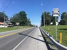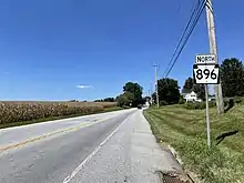 Pennsylvania Route 896 (PA 896) is a north–south state highway located in the counties of Chester and Lancaster in southeastern Pennsylvania. The southern terminus is at the Maryland state line just south of Strickersville in London Britain Township. South of the state line, the road continues as unsigned Maryland Route 896 (MD 896) for 0.21 mi (0.34 km), and then enters Delaware as Delaware Route 896 (DE 896) toward Newark. The northern terminus is at PA 340 in the East Lampeter Township community of Smoketown, just east of the city of Lancaster. The highway serves the borough of Strasburg, known for its Amish tourist attractions. The section south of the borough down to the state line is predominantly farmland. PA 896 follows a northwest-southeast orientation between PA 340 and the Maryland state line.