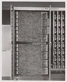 Mark I Perceptron machine, the first implementation of the perceptron algorithm. It was connected to a camera with 20×20 cadmium sulfide photocells to make a 400-pixel image. The main visible feature is the sensory-to-association plugboard, which sets different combinations of input features. To the right are arrays of potentiometers that implemented the adaptive weights.[2]:213