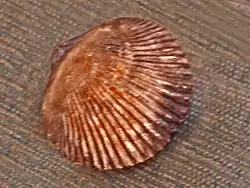 Lamarck's original specimen of Peregrinella multicarinata, from the French Alps, as first figured by Davidson (1850:plate XIV, fig. 37).Length and width of specimen  7.6 centimetres (3.0 in).[1]