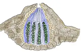 Diagram of a pseudothecium. Eight ascospores (green) are typically present in each ascus.