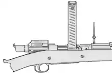During World War I, the United States secretly developed the Pedersen device attachment for the M1903 Springfield rifle that allowed it to fire the .30-18 Auto (7.65×20mm Longue) pistol cartridge in semi-automatic mode.[4][5] This attachment was developed to allow an infantryman to convert "his rifle to a form of submachine gun or automatic rifle" in approximately 15 seconds.[5][4]