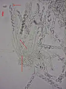Peziza spp. fruit body spore sacs teased out and viewed under a microscope