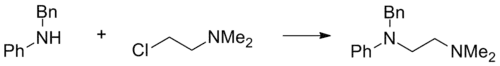 Phenbenzamine can be prepared by the reaction of N-benzylaniline with 2-chloroethyldimethylamine.[8][9]