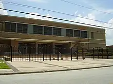 In 1927 Wheatley High School was one of the largest Black high schools in the United States with 2,600 students and 60 teachers,[4] and it was such throughout the Jim Crow era, when schools were segregated on the basis of race.[5] By 1949 Wheatley's first facility on Lyons Avenue became so overcrowded that students attended in shifts. During that year the 14-acre (5.7 ha), $2.5 million 4900 Market Street campus opened. The most expensive high school built in Houston at the time, the campus was designed by the firm MacKie & Kamrath in a Frank Lloyd Wright-influenced modernist style. The campus, described by the Houston Chronicle as "the finest Negro high school in the South," had a 1,500-seat auditorium, a gymnasium, an industrial arts facility, and a swimming pool. The school district spent attention on Wheatley in order to promote the argument that segregated minority schools can be equal to segregated White schools. The former Wheatley campus became E.O. Smith Middle School,[6][7] and later the Carter Career Center.[6]