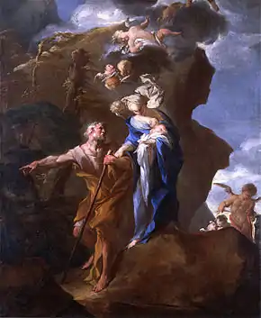 From 1684 to 1686, Cretey created a series of paintings for the refectory of the Benedictine abbey of Saint-Pierre, including The Last Supper, The Multiplication of the Loaves, The Assumption of the Virgin, The Ascension of Christ and an The prophet Elias. These refectory paintings (now in the Musée des beaux-arts de Lyon) show groups of figures vividly lit in front of dark backgrounds, recalling not only 16th-century Venetian pre-baroque prototypes but also Simon Vouet's early Italian works and their chiaroscuro.[2]