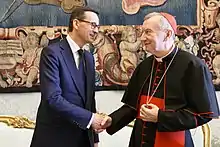 Parolin shakes hands with Prime Minister of Poland Mateusz Morawiecki, 4 June 2018