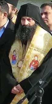 Porfirije was enthroned on 19 February 2021 in St. Michael's Cathedral in Belgrade.[47] Patriarchal insignias were handed over to him by Metropolitan Hrizostom of Dabar-Bosnia and Bishop Lukijan of Buda. In his introductory speech Porfirije focused on unity and peace building. He stated that Kosovo and Metohija is in his prayers, and the Serbs in the affected Kosovo and Metohija will be in his first place.[48] Also, he stated that Croatia has become his second homeland, and the people he met there will remain a role model for him in the years to come.[49] The inauguration was attended by numerous government ministers of Serbia, representatives of churches and religious communities in Serbia, and various politicians including Serbian President Aleksandar Vučić. The ceremony was also attended by Milorad Dodik, the chairman and the presiding Serb member of the Presidency of Bosnia and Herzegovina; Željka Cvijanović, the President of Republika Srpska (Serb-majority entity of Bosnia and Herzegovina); Apostolic Nuncio Luciano Suriani; Archbishop Stanislav Hočevar, the Catholic archbishop of Belgrade, Effendi Mustafa Jusufspahić, the Mufti of Serbia; and many other dignitaries such as Prince Filip Karađorđević, a member of the House of Karađorđević.[50][47] On 20 February, a day following the inauguration, a Holy Synod member and one of the three prime candidates for the new Patriarch election Bishop Irinej of Bačka tested positive for COVID-19.[51]