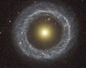 ![]() Hoag's Object is a ring galaxy, consisting of a symmetrical ring of young, hot blue stars surrounding a central nucleus of older yellow stars. The cause of its structure is not known: some galaxies of this time are formed by galactic collisions, but there seem to be no nearby candidates for the galaxy which collided with Hoag's Object. Credit: NASA and the Hubble Heritage Team |