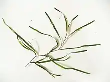 Hybrids with P. acutifolius[7] (P. × bambergensis Fischer), P. oxyphyllus (P. × faurei Miki) and P. trichoides (P. × ripoides Baagøe) [1][4] have been recorded. P. × bambergensis may be reasonably frequent where the two species coexist, but like many fine-leaved pondweed hybrids, is difficult to identify reliably without using genetic techniques.[7]