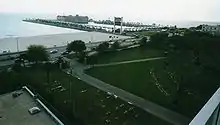 Following his death in 1959,[3] his widow Dorothy Brown, who was a noted New Orleans philanthropist,[4] renovated the property for a more modern look, including a wide arched canopy in the front.[3] In the early 1960s, the Mississippi Gulf Coast was emerging as a prime alternative to Florida as a southern vacation destination, and the Broadwater Beach Resort was considered the pacesetter for the area.[5] In 1963, Dorothy Brown spent $3 million to build a marina and a heliport.[2][5] The Broadwater Resort Marina plan was especially ambitious, involving hosting up to 150 sail and powerboats, and offering shore-to-ship maid service and room service to those docked, all in an effort to capture blue-water game fishing business.[5] When the marina opened in 1965, it was considered state of the art.[6] In 1968, she built the Broadwater Beach Sun Course on land originally owned by Jefferson Davis, and thus added golf as a prime attraction for visitors;[4][7] by 1974 a Sea Course was also present.[8] During the 1960s, a men's store was present in the hotel.[9] For entertainment, the hotel featured musicians from New Orleans and elsewhere.[10] From the 1950s on, operational control of the hotel and resort rested with Leigh MacConnell, one of the few women to rise to the top of the local hotel industry in that era.[11] In the 1960s the Broadwater Beach Resort found its glory years.[3] Hosting movie stars, leading politicians, and top business figures, as well as people on vacation,[11] it became the Gulf Coast's flagship resort.[3] During this decade, the iconic and colorfully lit Broadwater Beach Resort front sign was added.[3]