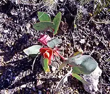 The red, bald-sheared trunk is unbranched and reaches a length of 500 mm. Brown, lance-shaped, scaly leaves appear at the base of the stem, and some stalkless, heart-shaped leaves zigzag along the tip, while others gradually shrink.[2]