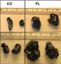 Mice lacking the Ovarian cancer G protein-coupled receptor 1 gene (OGR1) had slower melanoma growth (KO) than control mice with OGR1 (FL), possibly due to a difference in macrophage activity.[7]
