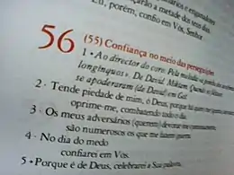 Psalm 56 is the 56th psalm of the Book of Psalms, beginning in English in the King James Version: "Be merciful unto me, O God: for man would swallow me up". In the slightly different numbering system of the Greek Septuagint version of the Bible and the Latin Vulgate, this psalm is Psalm 55. In Latin, it is known as "Miserere mei Deus quoniam conculcavit me homo".[1][2] The psalm is the first of a series of five psalms in this part of the book which are referred to as Miktams. It is attributed to King David and may be considered representative of him or anyone else hiding from an enemy.[3]