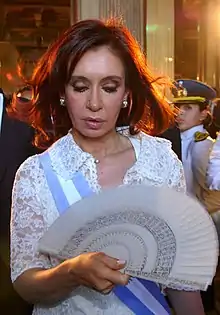 Fernández de Kirchner is famously glamorous and very passionate about clothes.[4][5] She wears a mixture of textures, colors, and prints, and always wears much makeup and high heels.[4] She dressed in black for three years following the death of her husband, Néstor Kirchner. The acceptance of this widow image was higher among Argentine women.[6] According to Fernández de Kirchner's detractors, her condition of widowhood was accompanied by a campaign of idealization of her late husband, who was allegedly treated as a religious figure.[7] She ceased wearing black clothes on November 20, 2013, after three years and a month.[8]