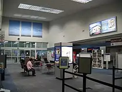 The modest commercial terminal is a single large room, divided between pre- and post-security areas by a single security checkpoint and glass walls. The waiting area occupies all space beyond the checkpoint but is not commonly used for waiting, as most passengers pass through the security checkpoint immediately before boarding. Both passenger gates are ground-level doors to the tarmac; passengers board via the fold-down aircraft-door stairs, or airstairs (for larger charter aircraft). Gate 1 on the east side of the terminal is used by Horizon Air.