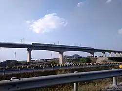 Qingdao–Rongcheng intercity railway is a high-speed railway located in China's, Shandong Province. It travels along the Shandong Peninsula connecting to Qingdao and Rongcheng. Line length is 298.842 km (186 mi) (containing a total length of sidings, spurs and depots etc. of 335 km (208 mi)). The design speed is based on 250 km/h (155 mph) service. However, it has been reserved for the line to be upgraded, if warranted, to 300 km/h (186 mph).[1] Construction consisted of a three-month preparation period, a building period of 27 months and with a joint testing and commissioning period of six months.[2] On December 28, 2014, the Qingdao–Rongcheng intercity railway opened from Jimo to Rongcheng.[3] The whole line opened on November 16, 2016.[4]