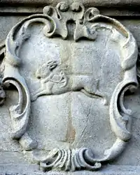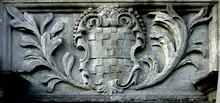 | Granville: Gules, three clarions or. For George Granville, 1st Baron Lansdowne of Bideford (1666-1735), nephew of John Granville, 1st Earl of Bath (1628–1701) and heir male of William Henry Granville, 3rd Earl of Bath (1692-1711).[45] It is the only escutcheon with heraldic supporters, generally reserved for use by nobility, here Two winged griffins rampant or. Above the escutcheon is a baron's coronet. He is identifiable by the style of his coronet and by his motto, shown inscribed on a scroll below: Deo, Patriae, Amicis[46] ("For God, my Country and Friends"), the motto of his uncle John Granville, 1st Earl of Bath having been: Futurum invisibile ("The future is unseen").[47] The arms are not those of John Granville, 1st Earl of Bath (1628–1701), or of his son Charles Granville, 2nd Earl of Bath (1661–1701). The latter's son William Granville, 3rd Earl of Bath (1692-1711) died aged only 19 two years before the building was completed in 1713. | ||||