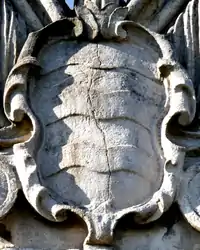The inscription was transcribed by the Devon topographer Rev. John Swete (d. 1821) in his "Journals".[16] On the sides of the base of the statue are identical heraldic escutcheons showing the arms of Robert Rolle impaling the arms of Duke, Per fesse argent and azure, three chaplets counterchanged, for his wife Elizabeth Duke (d. 1716), daughter of Richard Duke (1652–1733),[17] MP, of Otterton, Devon.