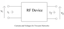 Each two-port network in an RF chain can be described by a parameter set, which relates the voltages and currents appearing at the terminals of that network.[4]: 29 Examples are: impedance parameters, i.e. z-parameters; admittance parameters, i.e. y-parameters or, for high frequency situations, scattering parameters, i.e. S-parameters.[5][6]: 663 Scattering parameters avoid the need for ports to be open or short-circuited, which are difficult requirements to achieve at microwave frequencies.