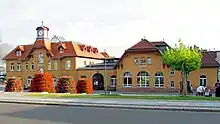 The redevelopment of the Dresden railway node from 1890 to 1901 included the quadruplication of the railway line to Leipzig between Dresden-Neustadt and Coswig. In this context, Radebeul station was fundamentally rebuilt between 1898 and 1901. The old station building had been squeezed in the space between the main railway and the narrow gauge railway and it was replaced by a new building further north, which went into operation on 25 October 1900 together with a new pedestrian subway to the island and side platforms.[10] Since then, both the standard gauge and the narrow-gauge railway lines have run to the south of the station building. That same year, four-track operations began between Radebeul and Coswig and these were extended between Radebeul and Dresden-Neustadt in 1901 with the opening of the new Dresden-Neustadt station. The level crossing of the street now called Hauptstraße (main street) was replaced by a road bridge and the new railway station was lit at night by electricity with power from the Niederlößnitz power station.