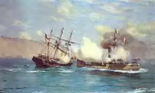 On May 16, 1879, the Huáscar sailed from Callao together with the Independencia, escorting the transports Chalaco, Limeña, Oroya and the monitors Manco Cápac and Atahualpa, but a few hours later they returned to Callao, because the boilers of the monitors were leaking.[3] They then left the convoy again on May 16 at midnight, but this time without the monitors. La Limeña is commissioned to Pacocha, where she arrives on the 19th, while the rest of the convoy arrives at Arica on the night of May 20, when Prado learns that the blockade of Iquique is sustained only by two old corvettes and that transports with 2,500 men which had left Valparaíso for Antofagasta.[4]: 285 Immediately, President Mariano Ignacio Prado, who had traveled on the Oroya, ordered the Huáscar and the Independencia to go to the port of Iquique to lift the blockade maintained by ships from the Chilean squad. On May 21, after a combat of more than three hours, the Huáscar sunk the Esmeralda in the Battle of Iquique, thus lifting the blockade of the port. This tactical victory had a high cost since, on the same day, the frigate Independencia was sunk during the Battle of Punta Gruesa.
