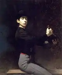 Ramon Casas i Carbó (Catalan pronunciation: [rəˈmoŋ ˈkazəs]; 4 January 1866 – 29 February 1932) was a Spanish artist. Living through a turbulent time in the history of his native Barcelona, he was known as a portraitist, sketching and painting the intellectual, economic, and political elite of Barcelona, Paris, Madrid, and beyond. He was also known for his paintings of crowd scenes ranging from the audience at a bullfight to the assembly for an execution to rioters in the Barcelona streets (El garrot). Also a graphic designer, his posters and postcards helped to define the Catalan art movement known as modernisme.[1]
