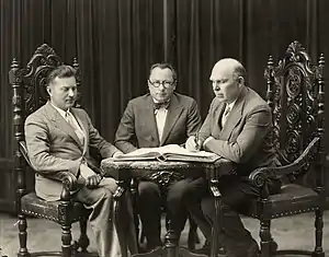 Skipitis (right) with collector Aleksandras Mykolas Račkus (left) who gifted his large numismatic collection to Lithuania during the first Congress of the World Lithuanians in 1935[14]