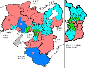 Single member results -- LDP in red, DPJ in light blue, Komeito in green