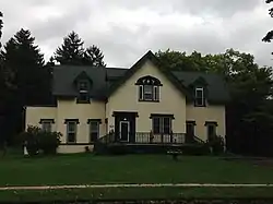 The Ring Lardner House is a 1+1⁄2-story Gothic Revival house with a gabled roof and dormers. It is clad with stucco. The dormers and roof have ornamental vergeboards [3]