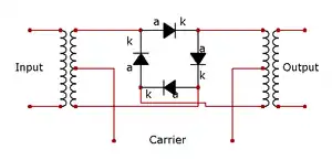 The carrier, which alternates between positive and negative current, at any given time makes one pair of diodes conduct, and reverse-biases the other pair. The conducting pair carries the signal from the left transformer secondary to the primary of the transformer at the right. If the left carrier terminal is positive, the top and bottom diodes conduct. If that terminal is negative, then the side diodes conduct, but create a polarity inversion between the transformers. This action is much like that of a DPDT (double pole, double throw) switch wired for reversing connections.