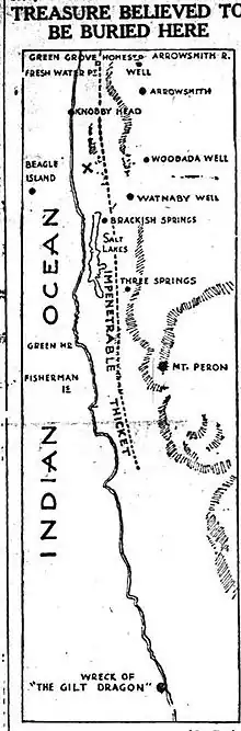 - ↑ Anonymous (1931), 'Police news: Human bones found,’ West Australian, 4 February 1931, p.11; Flowers, G. 2001 Gilt Dragon Terrestrial Investigation: Skeleton and Coin Sites, April 2001 (Innaloo: Maritime Archaeology Association of Western Australia) Annexures: Interview with Fred Edwards pp.2-4; Interview with Alister Edwards pp.1-2.
