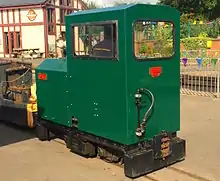 In December 1929, a 4 ft 8+12 in (1,435 mm) standard gauge 0-6-0 diesel locomotive was obtained to work the Ravenglass-Murthwaite section. It was built by Kerr Stuart (works number 4421) and had a six-cylinder, 90 horsepower (67 kW), McLaren-Benz engine. Transmission was mechanical and final drive was by roller chains. In 1955 it was sold, through a dealer, to the National Coal Board for use at Wingate Grange Colliery, Durham. A new Dorman engine of 90 horsepower (67 kW) was fitted in 1960.[9] It is now preserved at the Foxfield Light Railway,[10] restored to original external condition, and was displayed at Ravenglass in the summer of 2000.